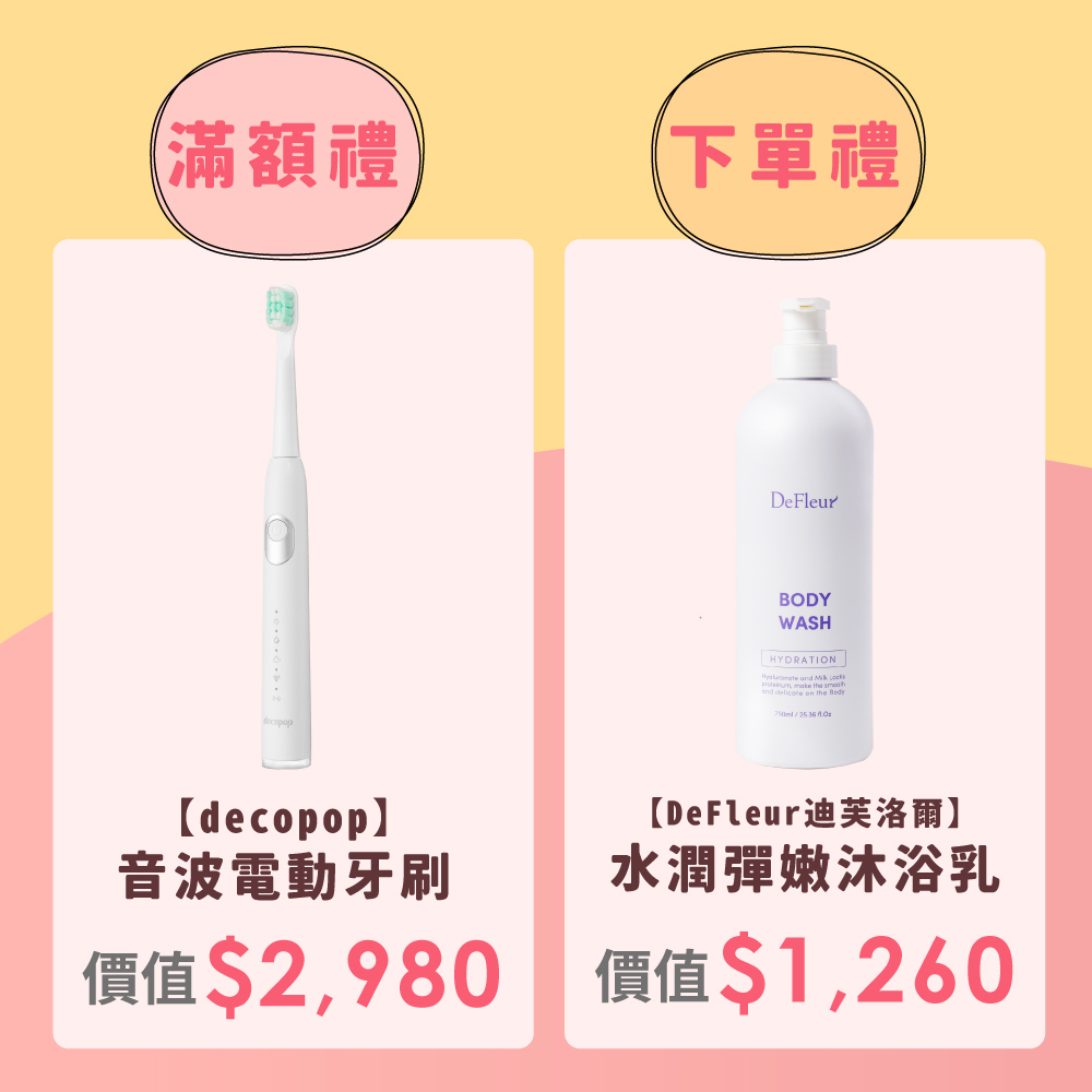 贈【decopop】極淨鑽白音波電動牙刷(原價:$2,980 / 贈品顏色隨機出貨)。
